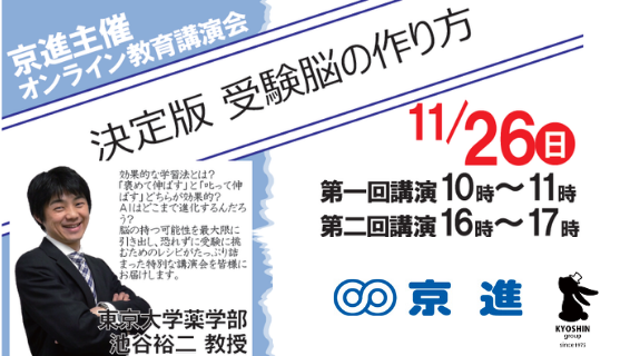 国内外に学習塾を展開する京進は、東京大学薬学部 池谷裕二教授による教育講演会「決定版 受験脳の作り方」を、2023年11月26日(日)にオンラインで開催します。主な対象は、小・中学生の保護者ですが、小・中学生や高校生でもテーマに関心があればご家族そろって参加いただける内容です。参加料は無料で、事前にお申込みが必要です。