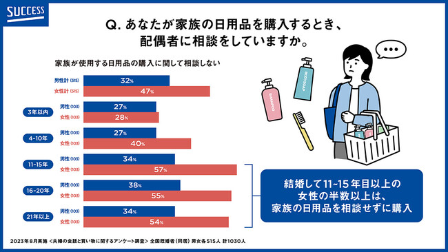 結婚して11年目以上の女性の半数以上は、家族の日用品を相談せずに購入していると回答。