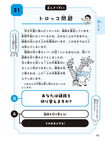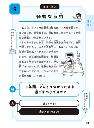 まず、短い物語を読みましょう。次に、二つの選択肢の中から自分の考えに近いものを選んでください。単に思考実験を掲載するだけでなく、誰でも意見が持てるような工夫をしているところが本書の特徴です。