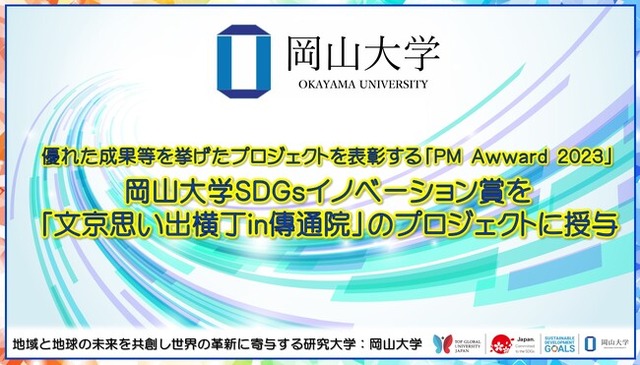 岡山大学は、PMI日本支部のアカデミック・スポンサーであり、研究力強化や産学連携・共創、イノベーション創出などの活動において、プロジェクトマネジメント手法を活用することで、効率・効果的な活動を実施しています。またアカデミアとして、博士人材や社会課題解決を中心としたスタートアップやベンチャーに関わる起業家など、知識によって新しい価値などを生み出すナレジッジワーカーの育成と輩出を進める人材育成を進めており、その育成プロセスにおいてもプロジェクトマネジメントの知識と技能を大切にしています。今回の授与におけるプロジェクトマネジメントの成果などを本学でも取り入れ、地域の中核である研究大学として、さまざまなステークホルダーらとともに現在と未来を切り開いていきます。どうそ今後も地域と地球の未来を共創し、社会変革を実現させる研究大学:岡山大学の絶え間ない変化と挑戦にご期待ください。