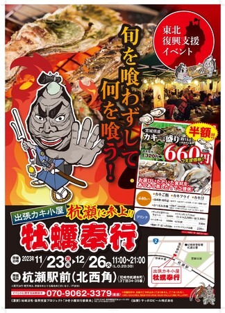 「出張カキ小屋 牡蠣奉行が杭瀬駅前特設会場に期間限定オープン。期間は11/23~12/26日まで。