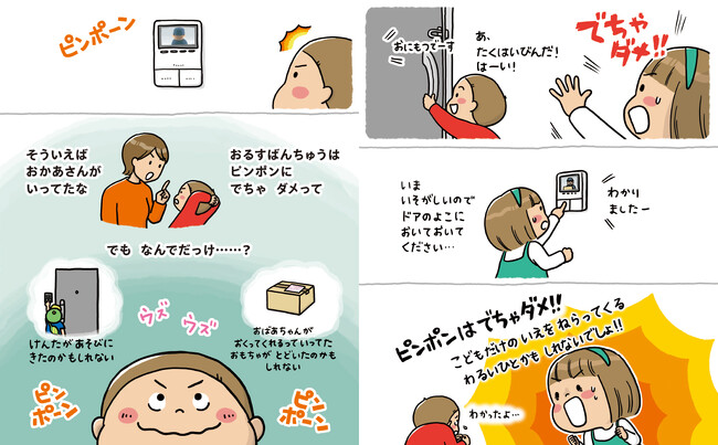 タイトルの「でない」は、家の外やベランダ、ピンポーンに出ない、「あけない」は玄関、風呂場、ベランダなどのドアを開けない、「のぼらない」は家具や浴槽などに登らない、という注意喚起です。