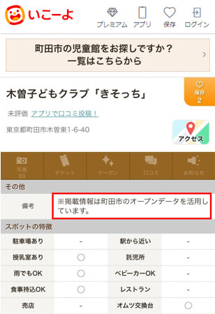 2023年11月より、東京都町田市の「子どもとおでかけ向け」施設のオープンデータを利用しています。データは「いこーよ」サイトおよびスマホ向けアプリの「おでかけ」情報欄に掲載され、どなたでも無料でサービスをご利用いただけます。なお、情報欄にはオープンデータを利用している旨が記載されます。
