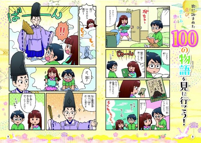 百人一首の1~100首をフルカラーのストーリーマンガや一コママンガで楽しく紹介しています。解説文では、当時の情景や難しいことばの意味をわかりやすく説明しています。