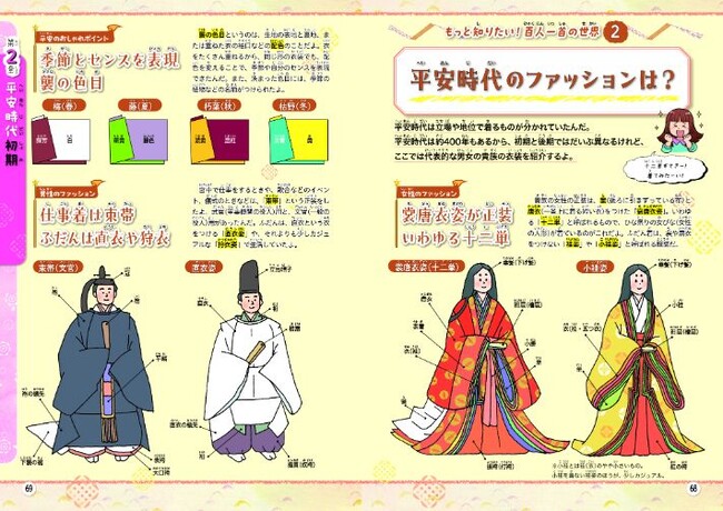 「平安京ってどんなところ?」「平安貴族はどんな暮らしをしていたの?」「どんな服を着ていたの?」などをテーマに、平安時代の衣食住や国風文化、摂関政治のしくみまで、豊富な史料と楽しい4コママンガでいつのまにか理解できるよう工夫しています。