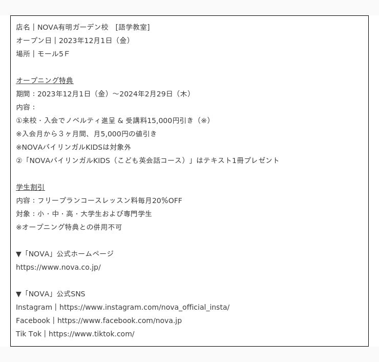 ▼「NOVAバイリンガルKIDS有明ガーデン校」の詳細はこちら