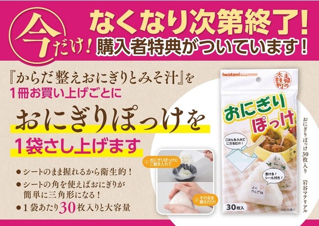 主婦と生活社から好評発売中の『からだ整えおにぎりとみそ汁』(藤井恵・著)の購入特典として、1冊お買い上げごとに、簡単&衛生的におにぎりをにぎることができる便利なシート“おにぎりぽっけ”を1袋差し上げます。9月に行った同キャンペーンでは売上が特典のない月と比べて181%アップ。実施店舗を大幅に拡大して実施することになりました。