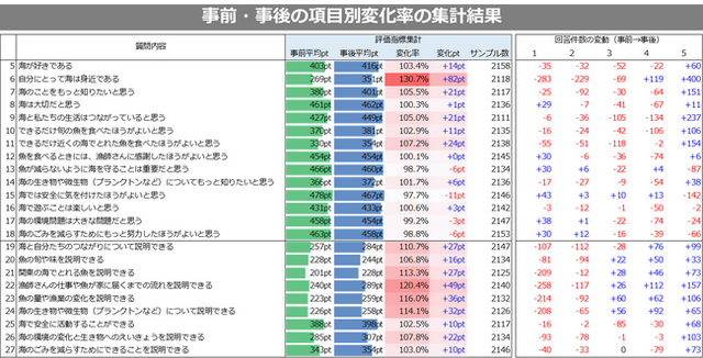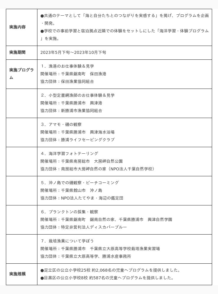 公立小学校向けに提供する「海洋学習・体験プロジェクト」(※後記参照)の取り組みとして、足立区の公立小学校5年生が実施する宿泊体験学習「鋸南自然教室」・目黒区の公立小学校6年生が実施する「興津自然宿泊体験教室」における活動の一環として、学校での事前学習と宿泊拠点近隣での体験をセットにした海洋学習・体験プログラムにおいて、事前授業の実施前と、現地プログラム体験後に、同一項目のアンケートを実施し、事前・事後での項目別変化率を算出しています。