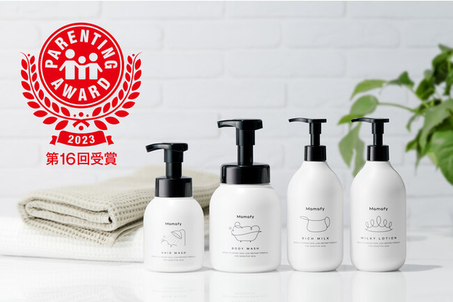「ペアレンティングアワード」は、育児雑誌メディアが中心となり、子育てにまつわるトレンド(ヒト・モノ・コト)を表彰し、信頼性が高くタイムリーな情報を提供するアワードです。今回、「ママフィ」は、独自の天然由来の保護膜<キトバリア(※1)>を肌表面につくり(※2)、ハウスダストや花粉といった外的刺激を防いで角層に潤いをとじ込め、新生児から継続的にバリア機能をサポートする“予防スキンケア”で、子どものすこやかな肌を応援したことが評価され、受賞に至りました。