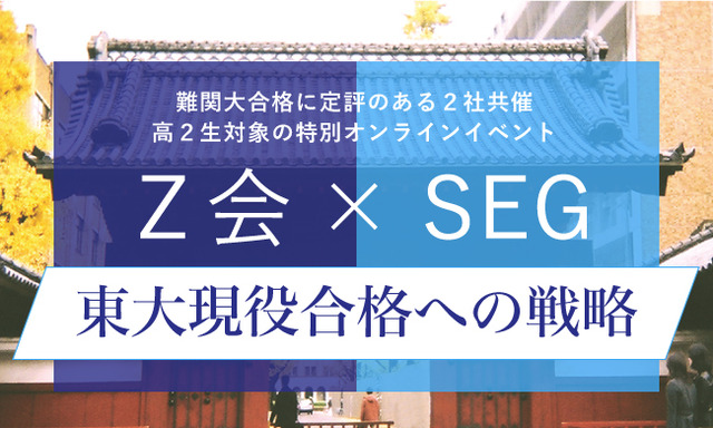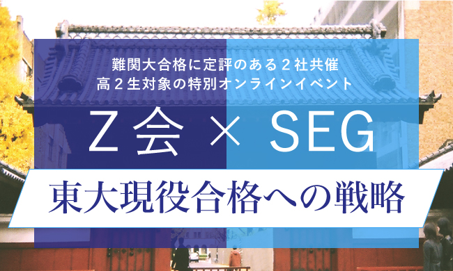 東大をはじめとする難関大学に圧倒的な合格実績を誇るZ会の通信教育・教室と、質の高い指導で定評のあるSEGの講師・スタッフが、東大をめざす高2生の皆さんに現役合格に向けて最大の効果を挙げる学習戦略をお伝えします。