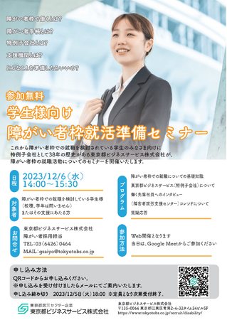障がい者枠で就職をするという選択肢について、一般就労と障がい者就労は何が違うのか?どんな人が障がい者就労の対象になるのか?誰に相談したら良いのか?等のお悩みや疑問にお答えするため、特例子会社として38年の歴史がある当社が、これから障がい者枠での就職を検討されている学生のみなさま向けに、障がい者枠の就職活動についてのセミナーを開催いたします。