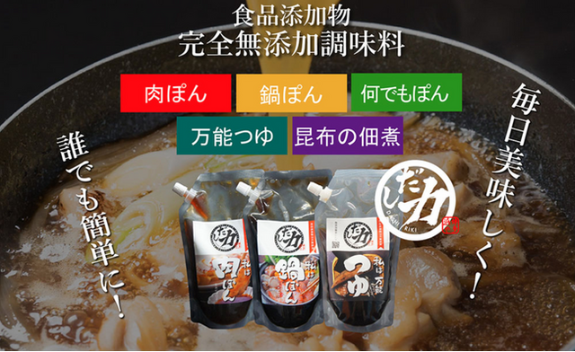 完全無添加にこだわり抜いた、本場博多唯一の「名店」の味をご家庭で。和食の基本にこだわり続け、研究を重ねた果てにたどりついた答え。それが『だし力』シリーズです。
