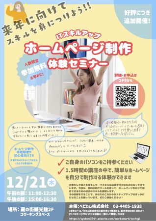 ベビカム株式会社(本社所在地:東京都千代田区、代表取締役:安西正育)は、「ITスキルアップ ホームページ制作体験セミナー」と題して、育児中の女性などを対象にした、リスキリングの一歩を踏み出すきっかけを作るためのセミナーを、栃木市で12月21日(木)に開催します。