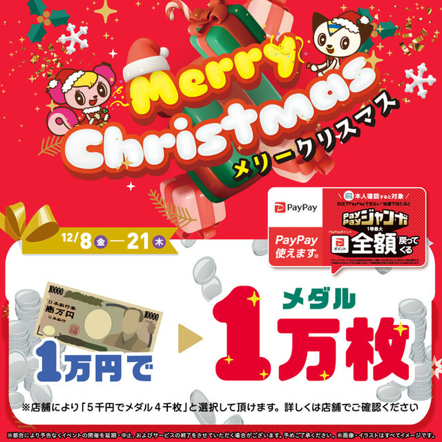 株式会社イオンファンタジー(本社:千葉県千葉市、代表取締役社長:藤原徳也、以下、当社)は、「モーリーファンタジー」「PALO」等のアミューズメント施設において、メダルコーナーで遊べるメダル貸出しがお得になるイベント「1万円でメダル1万枚」を12月8日(金)より開催いたします。通常の貸出枚数よりも大変お得な枚数でゲーム用メダルをお貸出しするイベントです。