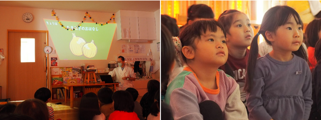 野菜のヒミツや不思議について子どもたちに興味を持ってもらえるようにと実施された今回の食育イベントでは、にじいろ保育園 高田馬場東のそら組(4歳児)、たいよう組(5歳児)計28名が、北海道で栽培され秋冬が旬である「スマイルボール」を使用して、タマネギの不思議について学びました。