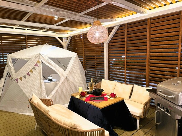 2023年7月に「あおぞらを楽しもう」をコンセプトにオープンした、木製ガゼボやアメリカンバーベキューグリルを完備した新横浜プリンスホテル初のBBQ施設、ROOF TOP BBQ「BREEZE TERRACE」。今回の斬新なコンビネーションにより、こたつとBBQが見事に調和し、寒さを感じさせない贅沢なアウトドアエクスペリエンスをお楽しみいただけます。