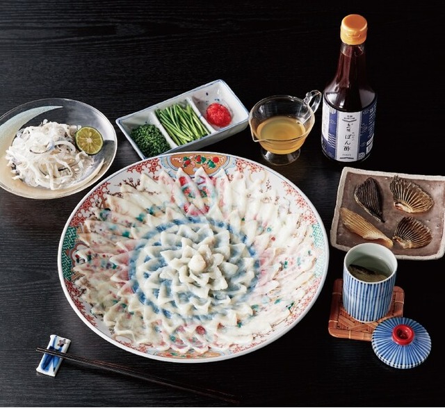 とらふぐ刺身75g(陶器皿24cm)、とらふぐ皮60g、だいだいぽん酢300ml、小葱10g、