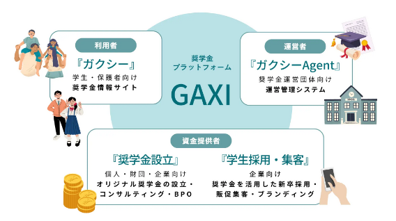ガクシーは、奨学金プラットフォームの開発・運営をはじめ、奨学金に関わる利用者、運営者、資金提供者それぞれへ向けたサービスをトータルで提供しています。