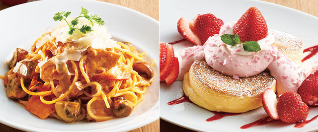 今回のフェアでは、三元豚のパストラミとブラウンマッシュの旨味がたっぷり楽しめる「三元豚のパストラミ トマトクリーム生パスタ」や、人気の苺を贅沢に使用したパンケーキ、ドリンクなどをご用意しました。