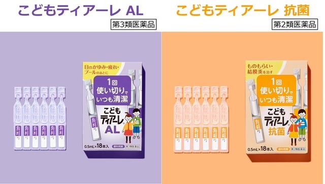 目のかゆみ・疲れに効く「こどもティアーレ AL」と、ものもらい・結膜炎に効く「こどもティアーレ 抗菌」のお子さまの目の症状に合わせた2つのラインナップをご用意しております。生後3ヵ月のお子さまからお使いいただける、低刺激設計の瞳にやさしい子ども用目薬です。