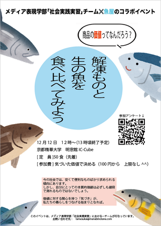 本イベントは、メディア表現学部3年次必須科目「社会実践実習」授業にて実施されるプロジェクトです。本授業では、学内外の教員による25のプロジェクトが設けられ、学生自身で取り組むべき課題を見つけて、社会に発信していくプロセスとその反応を実践的に学びます。同学部非常勤講師の森田秀之が担当するプロジェクトでは、「《買い支えていくべき店・職》に光をあてる」をテーマに掲げて取り組みました。商品の本質的価値を問いかけることを目的に、創業百年近い京都の鮮魚専門店「株式会社西浅」と連携し、魚の鮮度による変化を食べ比べて体験してもらうコラボレーションイベントを実施します。