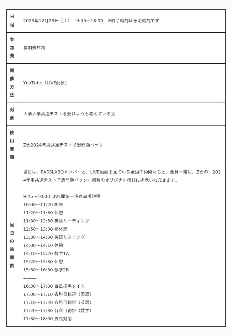 使用するのはZ会の『2024年用共通テスト予想問題パック』、参加媒体はYouTube LIVE動画なので、日本全国どこにいても、参加可能です!