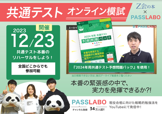 株式会社増進会ホールディングス(Z会グループ)のグループ会社、株式会社Z会ソリューションズは、株式会社ペイ・フォワードが運用するYouTubeチャンネル「PASSLABO」と協力をして、全国共通テスト模試を実施。YouTubeLIVE動画にて、2023年12月23日に行います。