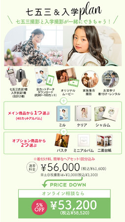 七五三と入学記念を一度にお祝いできるだけでなく、商品やオプションも盛りだくさんの『七五三&入学プラン』は通常56,000円(税込 61,600円)でご案内が可能です。