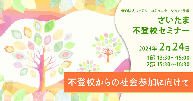 NPO法人ファミリーコミュニケーション・ラボ(所在地:大阪市天王寺区、代表者:鈴木典子、以下「ファミラボ」)は、2024年2月24日(土)埼玉県さいたま市にて、不登校状態を来している子の父親・母親を対象に、さいたま不登校セミナー 不登校からの社会参加に向けて「社会参加に必要な4つの力」を開催します。