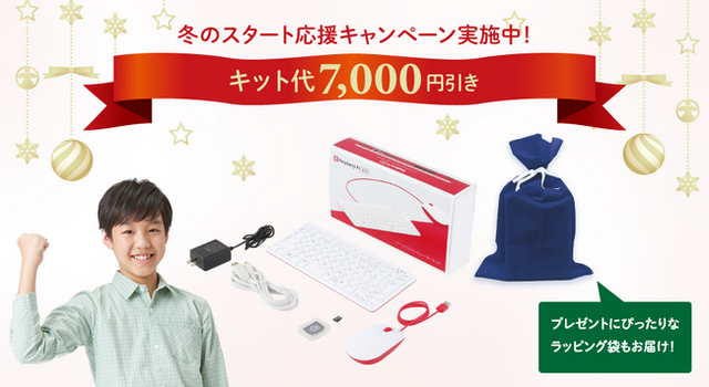 現在、冬のスタート応援キャンペーン実施中!Z会プログラミング中学技術活用力講座 コンピュータ活用編へのお申し込みと同時に、Raspberry Pi 400キットをご購入いただくと、キットを7,000円引きでご購入いただけます。さらに今ならラッピング袋もお届けするので、お子さまへのプレゼントにもぴったりです。
