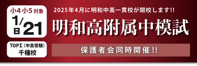 長期にわたる膨大なデータをもとに公立中高一貫校入試の傾向を予想し、模試を作成してきた京進は、明和高附属中入学を目指す現小学4・5年生にとって、実力を測る確かな道しるべとしていただけるよう、この模試を無料で提供いたします。また、本模試の受験生の保護者を対象に、明和高附属中受験に関する情報や対策などをお伝えする「保護者説明会」も同時刻に開催いたします。TOPΣは、子どもたちひとりひとりの夢・目標の実現するため、地域に密着した学習環境と情報の提供に努め、第一志望校合格に向けて職員一丸となって取り組んでまいります。