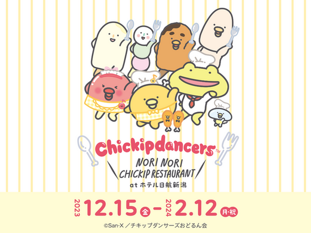 サンエックス株式会社(代表取締役社長:千田洋史、東京都千代田区)は“ばかうけ”“星たべよ”“瀬戸しお”など米菓を製造販売する株式会社栗山米菓(代表取締役社長:栗山敏昭 新潟市北区)が「チキップダンサーズ」とコラボし、新潟一の眺望を誇るBefcoばかうけ展望室 パノラマラウンジにて、2023年12月15日(金)から2024年2月12日(月・祝)までの期間、「チキップダンサーズ NORI NORI CHICKIP RESTAURANT at ホテル日航新潟」を開催することをお知らせします。