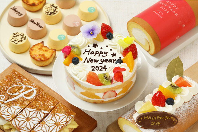 昨年もご好評いただいた、色とりどりのフルーツとエディブルフラワーを飾った華やかな『お正月デコレーションケーキ 5号・6号』、お得なお年玉券をお付けした「おみくじ」がセットになった『お正月ロール』や『ピネードロール』、10月に開催した「ピネード」創業39周年祭「PINEDE 39th Anniversary」でのご好評を受け、定番商品となった『ミルフィーユ Melody』のお正月限定デザイン『お正月ミルフィーユ Melody』、紅白カラーの『さらにおいしいチーズケーキ(プレーン・ラズベリー)』と「ねこねこ」の人気商品『にゃんチー プレーン』がセットになった『お正月チーズケーキ 10個入』、さらにギフトとしてご好評いただいている『プチモンブラン』にお正月限定の巻き紙をお付けした『お正月 プチモンブラン 12個入』の全6品をご用意いたしました。
