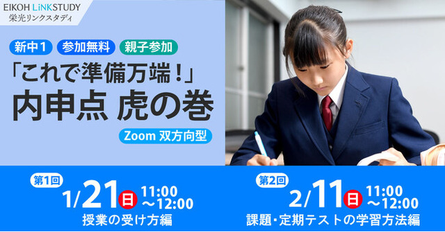 そこで、オンライン進学塾「EIKOH LiNKSTUDY(栄光リンクスタディ)」では、来春に中学入学を控える小学6年生とその保護者を対象に、中学校でよい成績を取るための秘訣を伝授します。自信をもって中学校生活を始め、中学1年生から高い内申点を取れるよう、簡単なワークや問題演習を交えながら、『今からできる内申対策』をお伝えします。