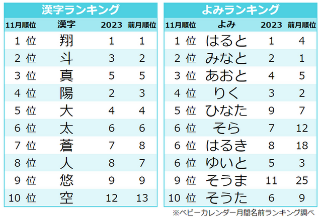 11月に生まれた男の子の名前の漢字ランキングTOP3は、1位「翔」、2位「斗」、3位は「真」でした。「翔」は2022年12月以来、実に12カ月連続の首位! ロサンゼルス・エンゼルスで投手と打者の二刀流として活躍し、WBCでもMVPを受賞した大谷翔平選手の名前にも使われている「翔」が、引き続き大人気です。