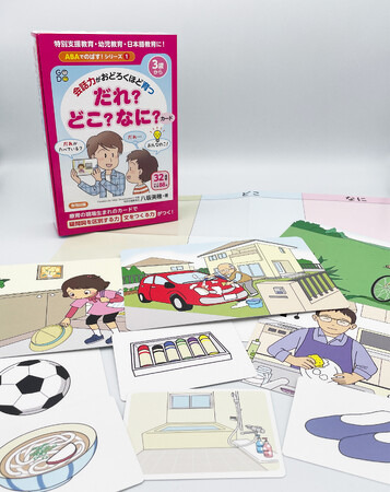 このカードは自閉スペクトラム症をはじめとする神経発達症(発達障害、知的障害)のある子どもが、「だれ・どこ・なに」という疑問詞に適切に答えられるようになることを目指す学習教材です。