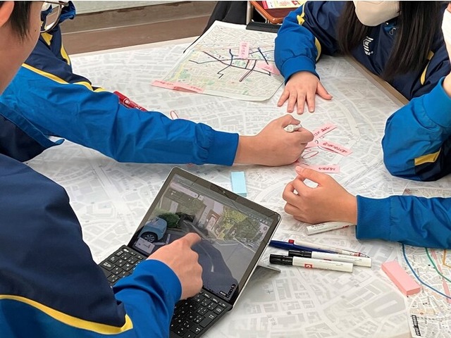 事前課題として生徒に中学校周辺地域を実際に歩いてもらい、災害時の避難経路として危険性がある場所、安全な場所、歩きやすい場所などをバリアフリー視点も加味して調査してもらいました。