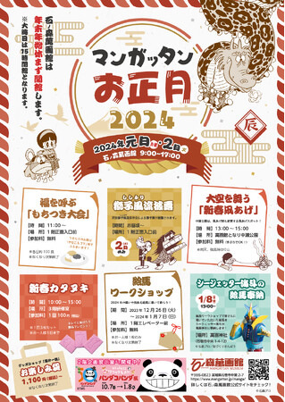 元日~2日は恒例のお正月イベントも開催します。来館された方々と一緒に行う「福を呼ぶ もちつき大会」や「凧あげ」をはじめとしたお正月らしいイベントも開催しますので是非萬画館に遊びに来てください。