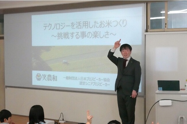 今回講師として授業を行ったのは、株式会社笑農和 代表取締役、一般財団法人日本プロスピーカー協会認定シニアプロスピーカーの下村 豪徳氏です。下村氏は、富山県滑川市で、水稲農家向けにスマホで水管理できるサブスクリプションサービスをはじめ、「農業×IT」で生産者の悩みを解決する事業を展開しています。