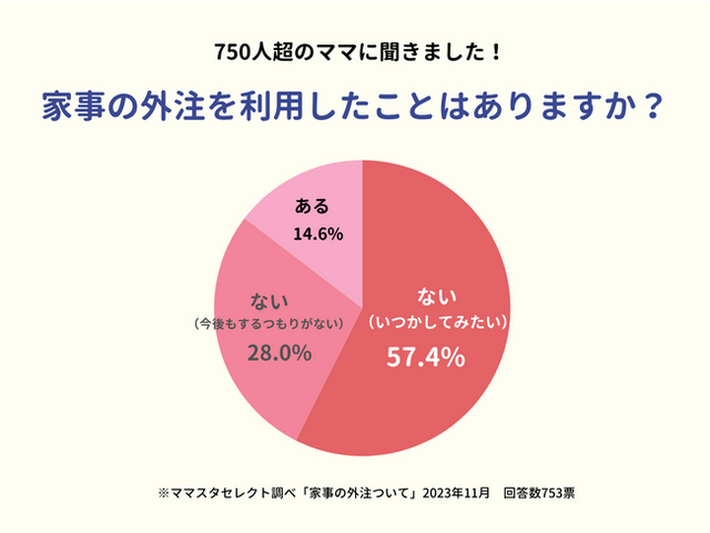今回ママスタセレクトでは「家事の外注をしたことはありますか?」というアンケートを実施しました。選択肢には「利用したことがある」「利用したことがない(いつかしてみたい)」「利用したことがない(今後もそのつもりがない)」の3つを設定。753人から回答を得ることができました。「家事の外注を利用したことがない」と回答した人が、全体の8割を超える結果となりました。