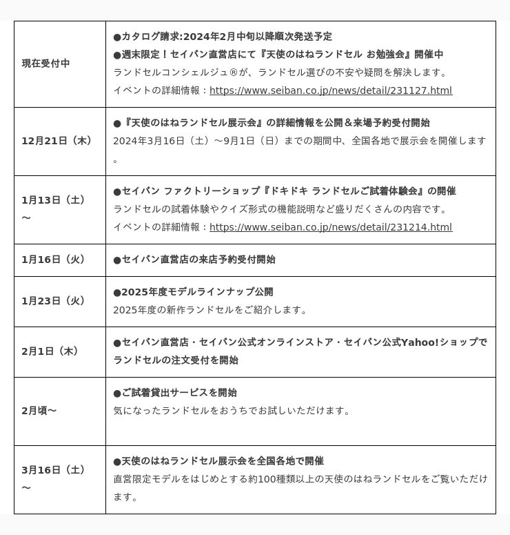販売にあたり、本日2023年12月14日(木)に2025年度ご入学者さま向け販売スケジュールをセイバン公式「天使のはね」ブランドサイトにて公開いたしました。また、今後のスケジュールにつきましては、2023年12月21日(木)に『天使のはねランドセル展示会』の詳細情報の公開および来場予約受付開始、2024年1月16日(火)にセイバン直営店の来店予約受付開始、2024年1月23日(火)に2025年度モデルのラインナップの公開を予定しております。