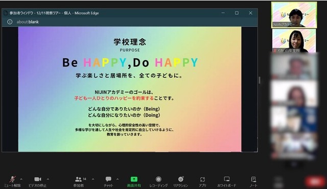 日本中の学校をハッピーにする株式会社NIJIN(本社:東京都江東区、代表取締役:星野達郎)が運営する小中学生向けオンラインスクール「NIJINアカデミー」は、12月11日に外部向けの視察ツアーを開催しました。教育委員会や小中学校、民間企業など、8団体・計14名の方々にご参加いただきました。