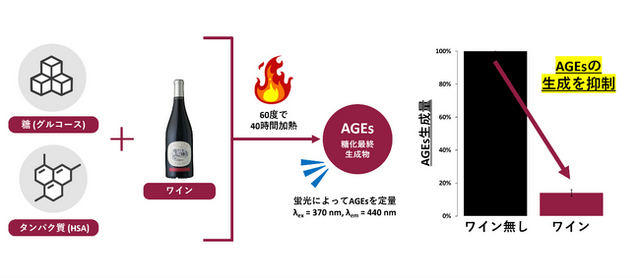 本研究で得られた成果は、ワインが強い抗糖化作用を有することを示すと同時に、色や品種、産地、製法などによってもその効果が異なることを示しています。中でも一部の赤ワインには強い抗糖化作用があり、女性においては、この抗糖化作用の強い赤ワインの摂取によって、体内のAGEsを減少させるのに有用である可能性が示唆されました。
