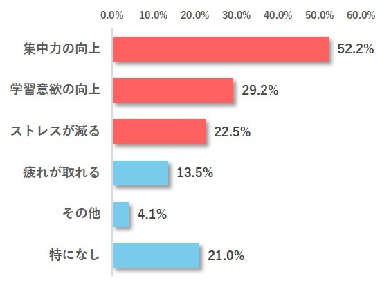 塾前食を食べると回答した414名を対象に、塾前食を食べることで、学習にどんな影響や効果があるか質問したところ、最多回答は「集中力の向上(52.2%)」、次に「学習意欲の向上(29.2%)」、「ストレスが減る(22.5%)」という結果になりました。塾前食を食べることで、半数以上の中学生が集中力があがっていることを実感しているようです。
