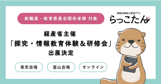 自治体向けサービスを開発する株式会社ミラボ(本社:東京都千代田区、代表取締役:谷川一也、以下「ミラボ」)と、情報モラル教育・プログラミング教育を手がける株式会社教育ネット(本社:神奈川県横浜市、代表取締役:大笹いづみ、以下「教育ネット」)が共同開発したクラウド型デジタルAI教材「らっこたん」が、経済産業省主催『探究・情報教育体験&研修会』への出展が決定しました。
