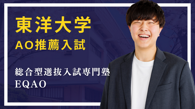 〈東洋大学の推薦入試(総合型・公募)に強い〉東洋大学の推薦入試において高い合格率を誇るEQAO。推薦入試で東洋大学に合格したい高校1・2・3年生は必見です。EQAO創業者の玉村と1時間無料で、東洋大学の特徴についてや、東洋大学の推薦入試の対策方法、志望理由書の書き方、課せられるレポートや小論文の書き方、面接で求められる人材、プレゼン方法や資料の作り方、ディスカッションのポイントなど、幅広く相談可能です。お一人様一回限りの受講となります。2023年12月18日より受付開始となります。定員は30名とさせていただきます。定員に達した時点で受付を停止いたします。東洋大学に現役合格を目指す方はぜひ応募してください。※保護者の方も受講可能です。東洋大学に合格するなら総合選抜型・学校推薦型選抜入試専門塾EQAO! EQAO は総合選抜型・学校推薦型選抜入試(公募制)に圧倒的な自信がございます。