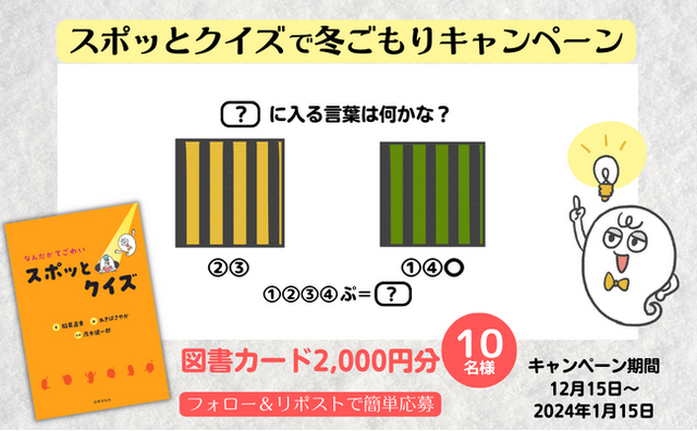 株式会社世界文化社より脳トレにもぴったりな新感覚のパズル書籍『なんだかてごわい スポッとクイズ』(著・稲葉直貴/絵・あきばさやか/監修・茂木健一郎)が好評発売中です。子どもも大人もわいわい集まるこの季節をより楽しんでいただくため、本と図書カートをセットにした「スポッとクイズで冬ごもりキャンペーン」をX(旧Twitter)で開催いたします。