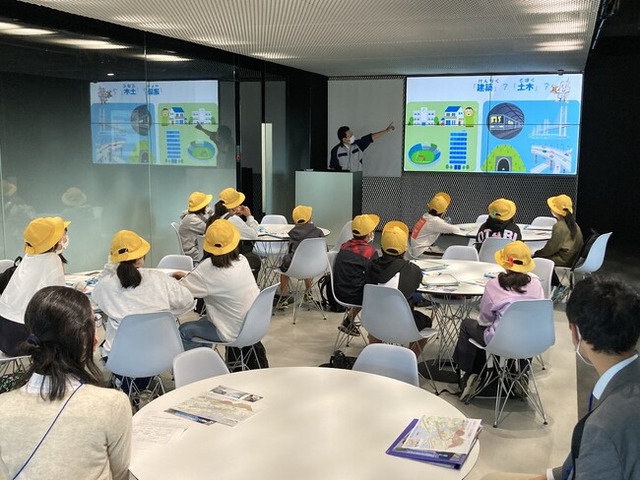 「土木の日」の由来や建設会社の仕事、身近にある“土木”や“建築”について説明を行い、建設業の社会的使命や魅力を紹介しました。