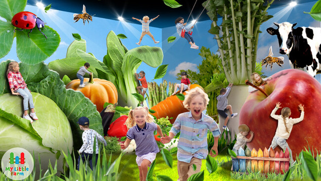 「マイリトルファーム」は、ふしぎな農場の中を冒険しながら楽しく遊べる屋内型農場テーマパークです。パーク内には、現実世界ではありえないほど巨大な野菜や果物が実るほか、見上げるほど大きな虫や動物が暮らすなど、ワクワクする空間が広がります。