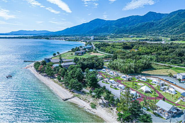 目の前には琵琶湖が広がり、砂浜まで10歩。振り向けば比良山系の山並みを望む、四季折々の美しい自然に囲まれ、調和する12棟のグランピングリゾートです。